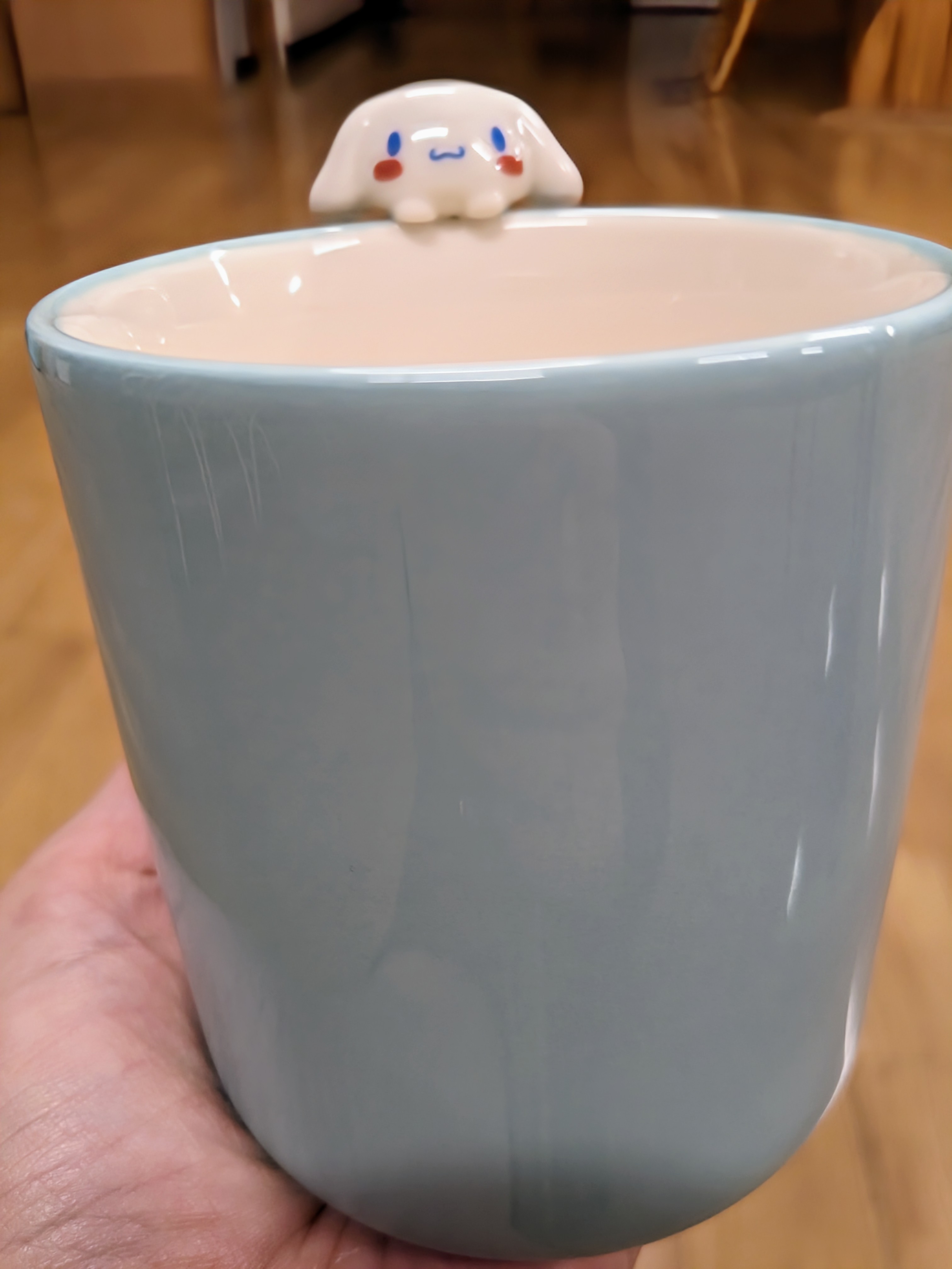 サンリオのシナモロールがひょっこり顔を出しているお気に入りのコップです。