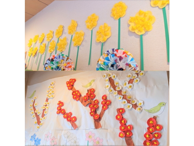 春に向けて、お花紙と色画用紙で菜の花や梅の花を利用者様と一緒に作り、玄関に飾りました。