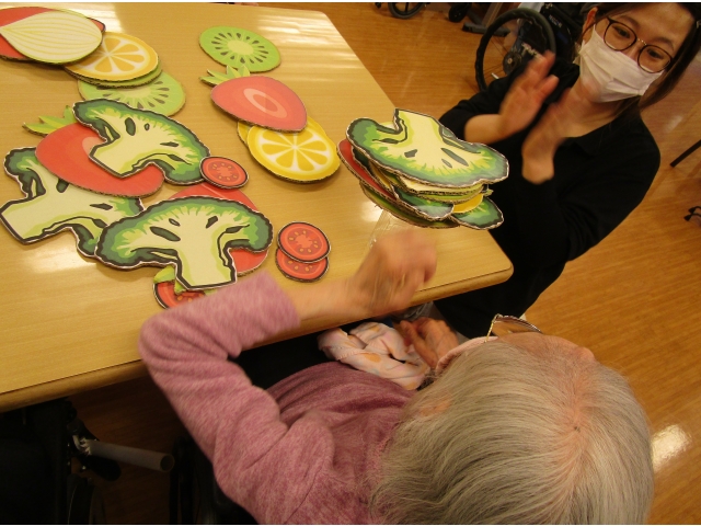 様々な形の野菜やフルーツをペットボトルの上に積み上げ、倒したら負けというゲームを行いました🤩
