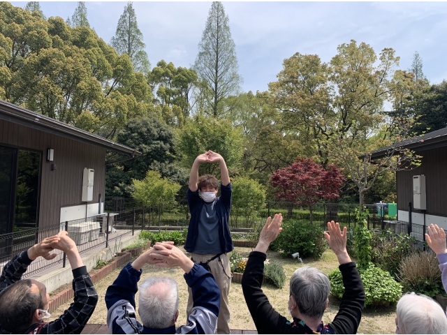中庭で利用者様と体操をしました。