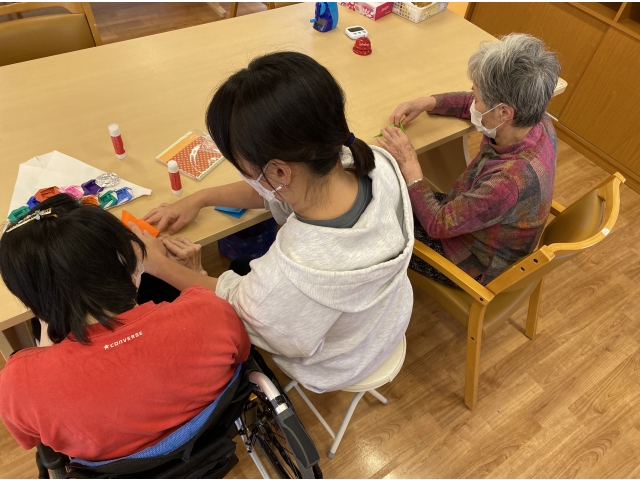 利用者様と一緒に施設内の装飾品を作っています。今回は薔薇の花作りです。花束をイメージして作り、施設内を薔薇いっぱいにしようと考えています!!完成が楽しみですね♪