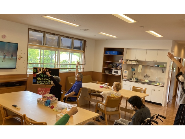 毎日元気に生活できるよう、室内でも積極的に運動の機会を設けています。本日は椅子に座りながら気軽にできる体操です!!普段動かさない部分をしっかり伸ばすと、体が軽くなり気持ちもスッキリしますね!!