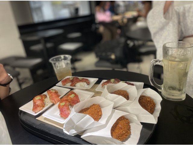 屋台がずらりと並んでいて、海鮮天ぷら、黒毛和牛のステーキ、海鮮焼きなど、様々なメニューがありました。