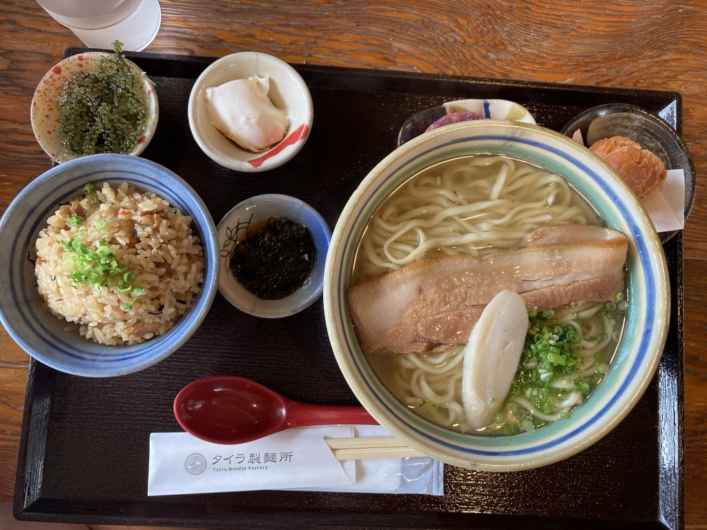 ソーキそばとジューシーのセットです!こちらもソーキ(スペアリブ)がドカンとのっています!ジューシーとは、沖縄の言葉で炊き込みご飯のことです。