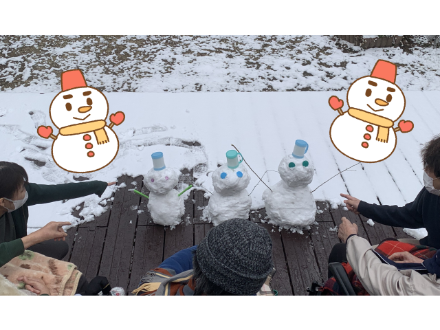 この日、朝から雪が舞っていたので可愛い雪だるまを作りました!利用者様と中庭に出て「寒い~~!!」と言いながら久しぶりの雪を楽しみました♪