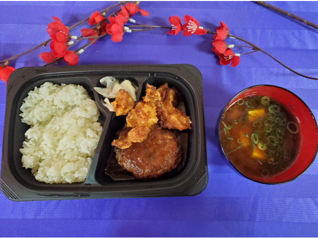 ミニチーズINハンバーグ&若鶏の唐揚げ弁当を提供しました。
