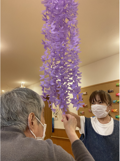 フロアの装飾はいつも季節感を取り入れることをモットーにしています。今回は藤の花をイメージした装飾を作って飾りました。利用者様も藤の花の出来栄えに「えっ本物だと思ったわ」「もうそんな季節ね」と様々な反応が聞こえてきました。