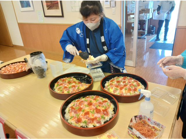 初の試みとして、毎日の食事でお世話になっている(株)ナリコマエンタープライズさんに出張で豪華バラちらし寿司🍣を作っていただきました!また、屋台やゲーム、記念撮影など大いに盛り上がりました(*^-^*)