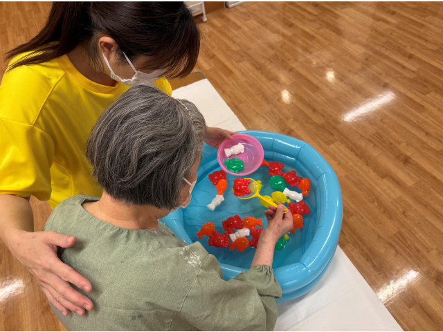 施設レクで夏の風物詩金魚すくいを行いました🐠✨色とりどりのかわいい金魚が水に浮かぶ様子を見て、皆さん笑顔に♪「昔よくやったわ〜」「すくうの難しいねぇ」と夢中になってポイを握る姿がとても印象的でした☺️🎵