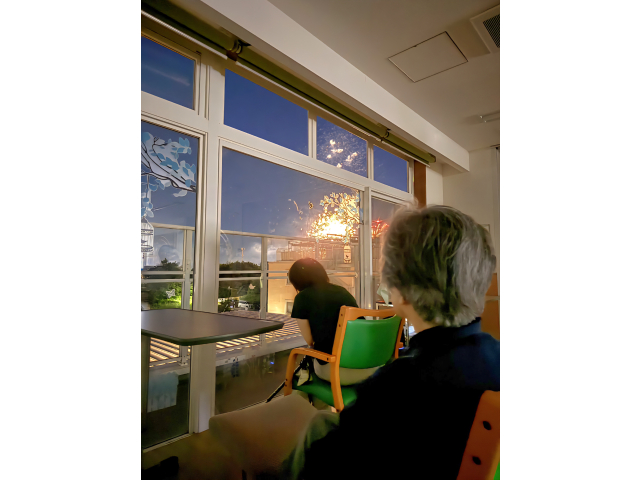 先日、施設のバルコニーから見える夜空に志段味夏祭りの打ち上げ花火が咲きました!