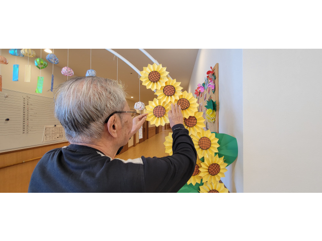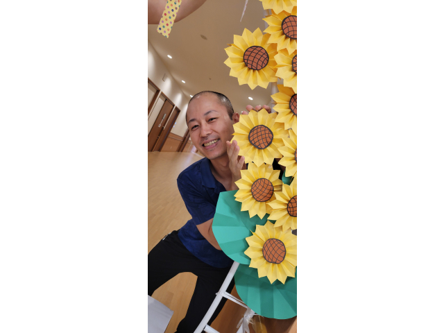 色紙を丁寧に切ったり、花びらの形を整えたりしながら、利用者様と一緒にひまわりを作製し、お花のトンネルを作りました☆