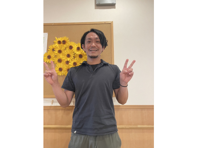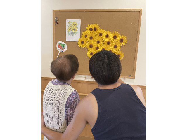 夏の風物詩といえば、ひまわりですね🌻スタッフが作ったひまわりを見て「とても上手に作ったんだね。キレイだわ!」と笑顔で話されていました。