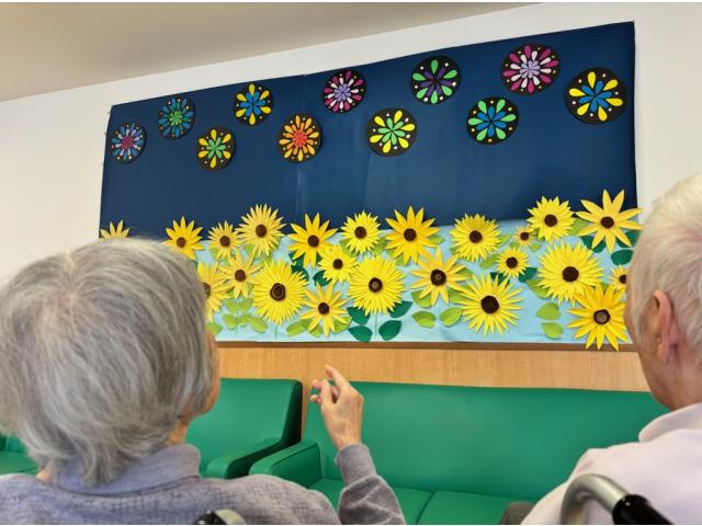 夏といえば花火ですね★☆GREEN HOUSE 1Fは花火とひまわりを作製し飾っております!
