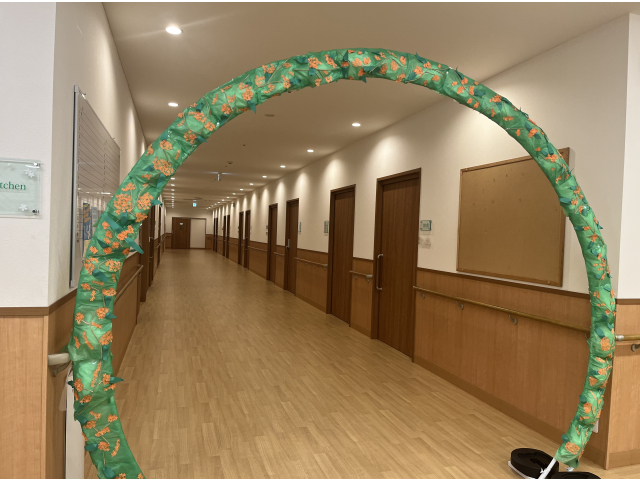 キンモクセイのアーチを作製しました♪そして!なんと!!このアーチ!!キンモクセイの香りがふんわりとするのです(*'▽')