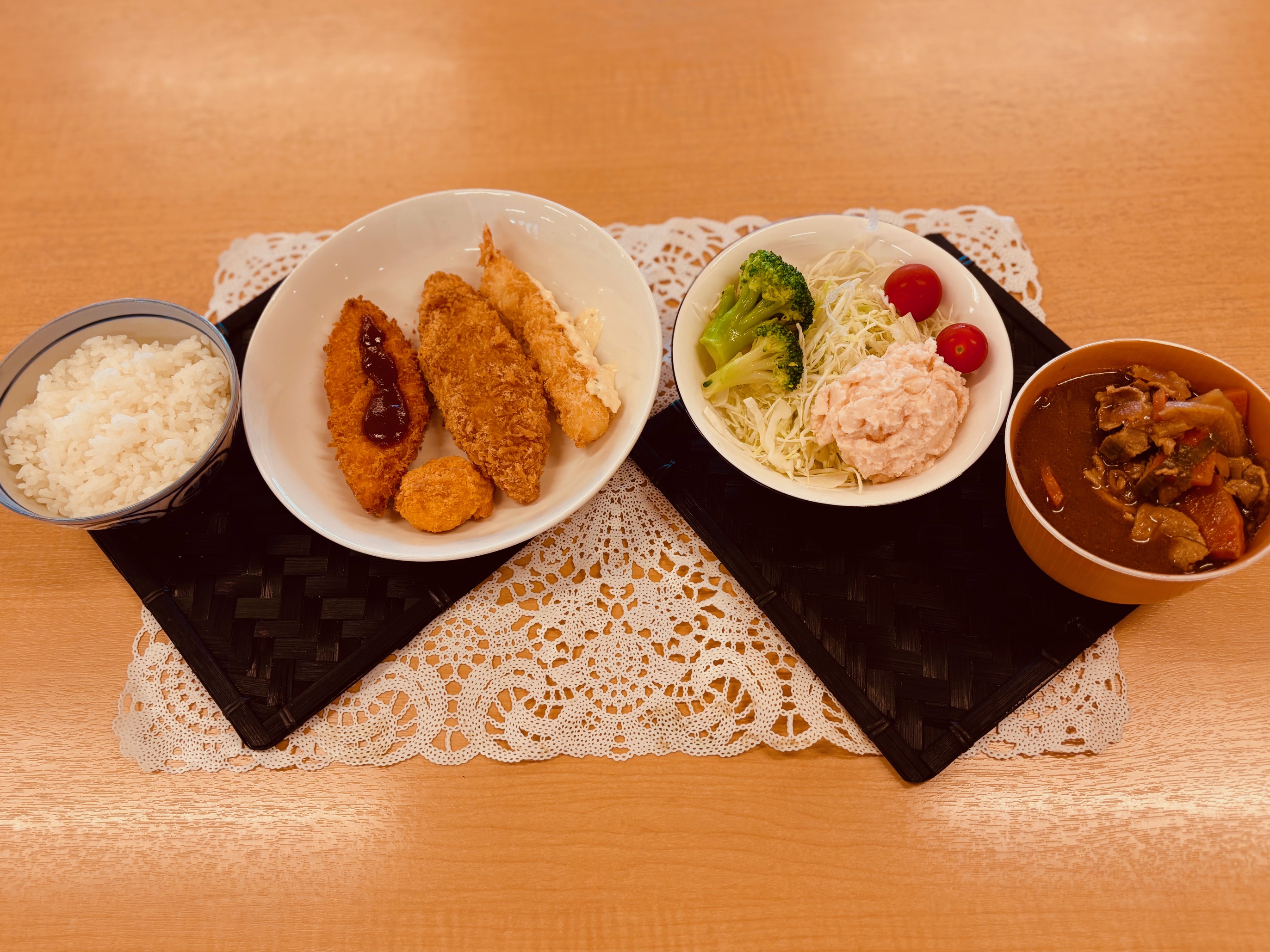 白身魚フライ・サーモンフライ・エビフライ・ホタテフライのほかに味噌汁とサラダも付いた豪華な定食(^-^)