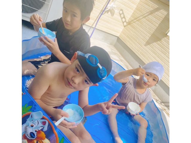 今年の夏もすごく暑かったので、自宅のベランダでプール遊びをしました(^^)子供たちは炎天下にプール内で食べるかき氷が格別みたいですが、食べると一気にクールダウンしてしまい、ご覧の表情になっています(笑)