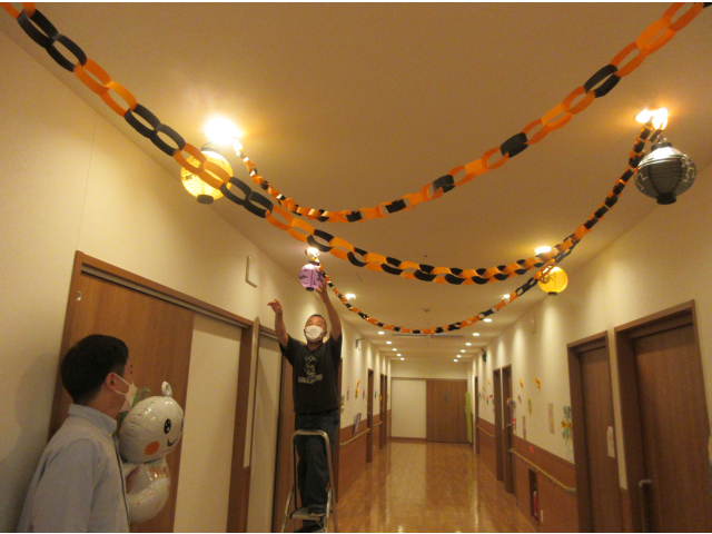 10月になったのでフロアの装飾をハロウィンにしました。利用者様に折り紙で作っていただいた飾りをたくさん使って、とても素敵な飾り付けができました!!