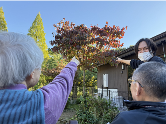 秋が深まり、中庭のハナミズキやもみじが紅葉してきました。雨上がりで空気がとても澄んでおり、日差しもぽかぽかだったので利用者様と日向ぼっこ(*^-^*)