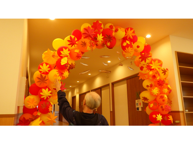 フロアを秋らしくモミジとイチョウで飾り付けしました。