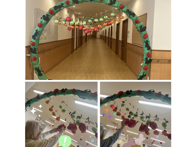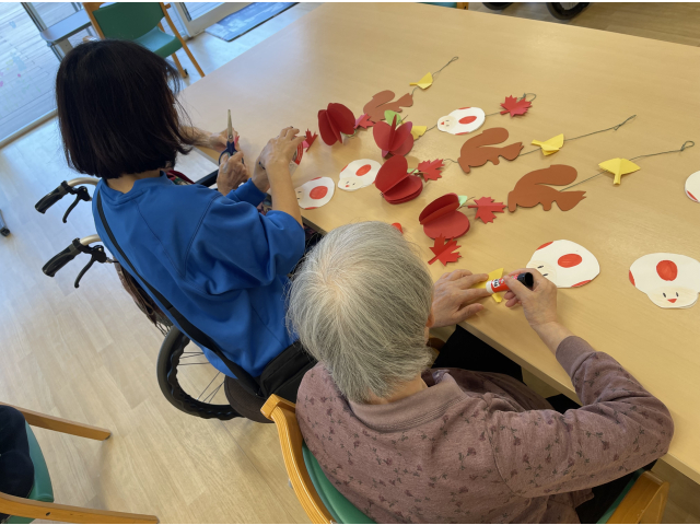 利用者様と一緒に、秋の飾りを作りました!りんごやキノコ、紅葉など、色とりどりのパーツを貼り合わせながら「かわいいね」「ここはこうしようか」と会話が弾みました。季節を感じながらの共同作業に、皆様自然と笑みがこぼれました( *´艸`)