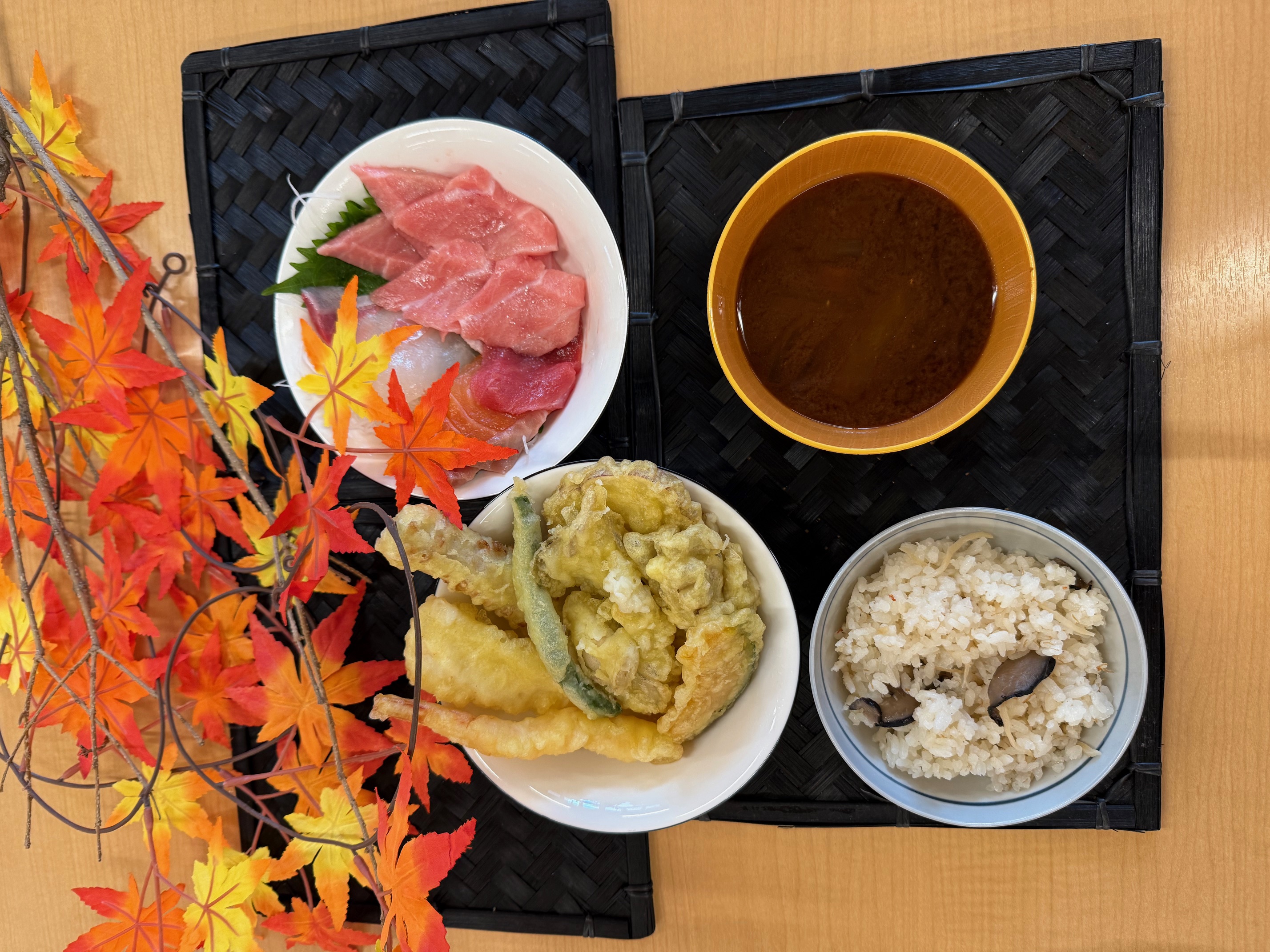 蟹の炊き込みご飯、天ぷら、お刺身盛り合わせ、お味噌汁です。