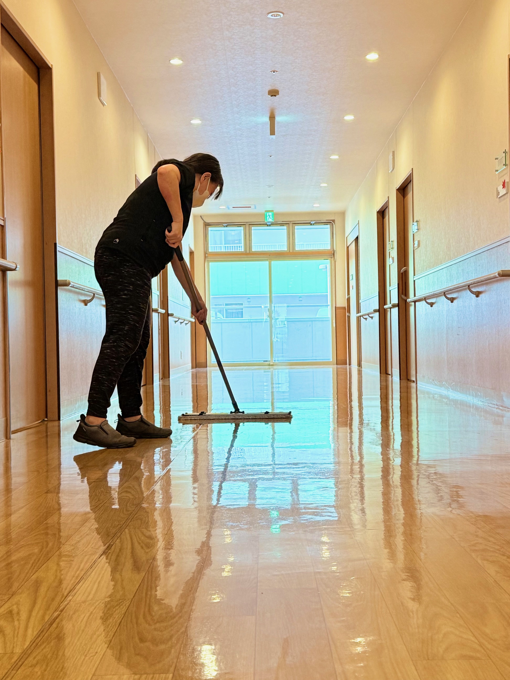 まずは廊下から。掃除機をかけてから汚れをしっかりモップで拭き取ります。