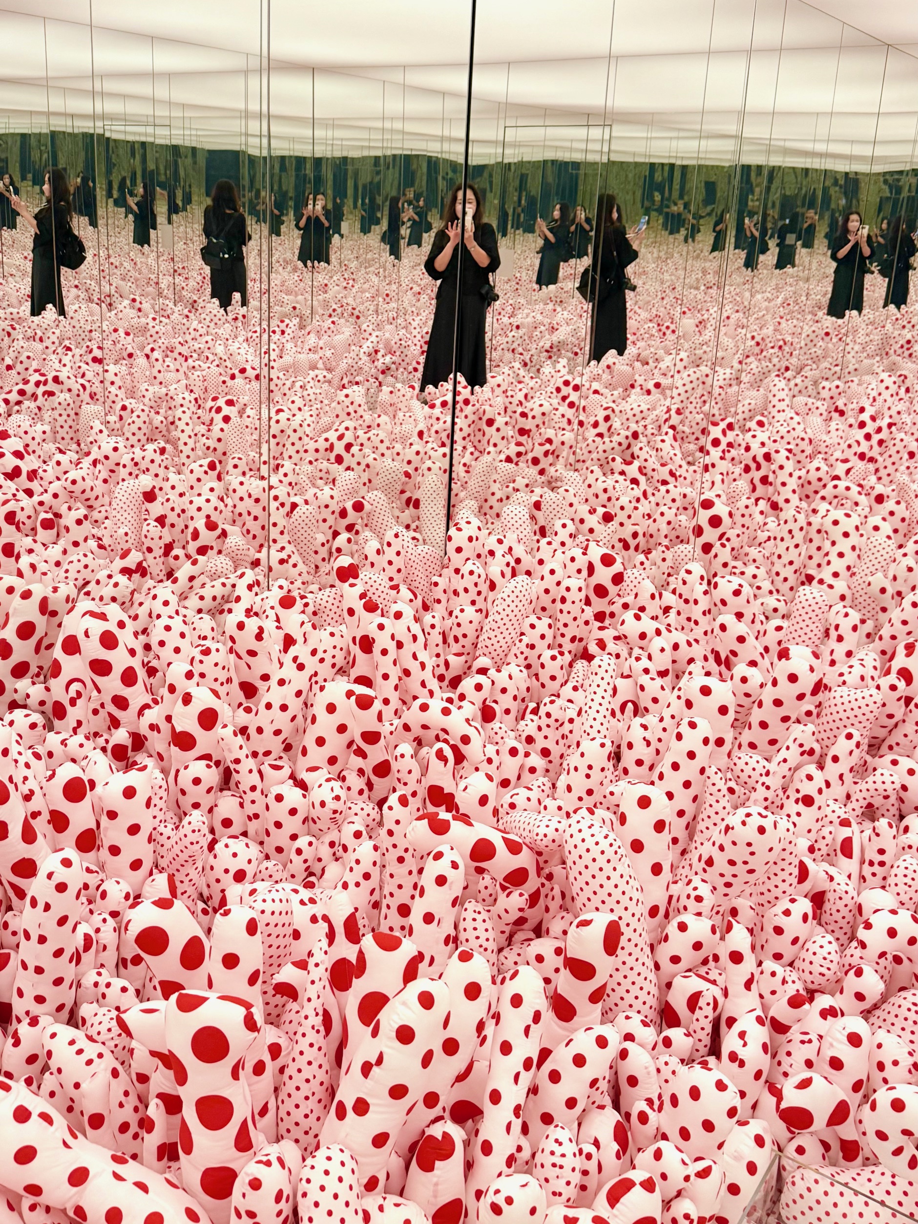 この写真は、水玉模様をモチーフにした作品で世界的にも有名な芸術家の草間彌生さんの作品です。