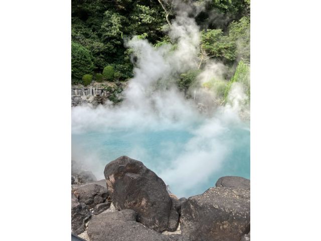 海地獄は、コバルトブルーに輝き、地獄というのがふさわしくないほどの美しさです。温泉中に含まれる硫酸鉄が溶け込んでいるため、鮮やかな青色になるそうです。