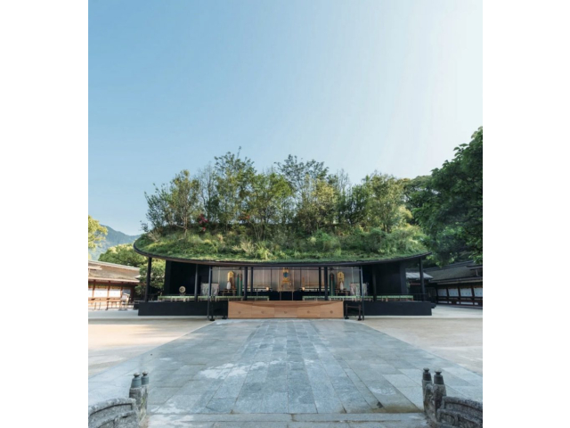 現在本殿改修工事のため、仮殿での参拝になりますが、周囲の景観に調和した素晴らしい仮殿で、屋根には草木が植栽されており、今だけ見られる風景です。