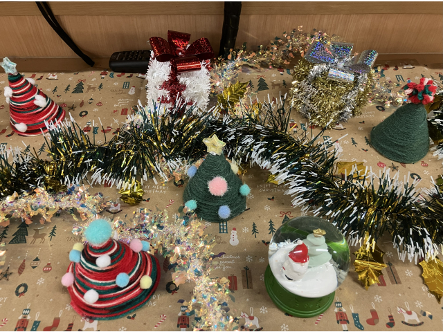 今年は、毛糸で作ったかわいいクリスマスツリーとスノードームを飾りましたよ🎄
