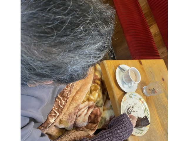 コメダ珈琲店に行きました。ミルクティーやチョコレートケーキを注文して「美味しいわ」と笑顔がいっぱいでした。