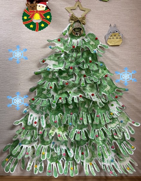 このクリスマスツリーは、薄めた水彩絵の具を利用者様の手に塗り、手形にして作りました。「くすぐったいね」「どんな風になるんだろう」とワクワクされていました。完成したツリーを眺め「もうすぐクリスマスだね」「綺麗だね」「私の手形はどれだろう?」と会話が弾みました。