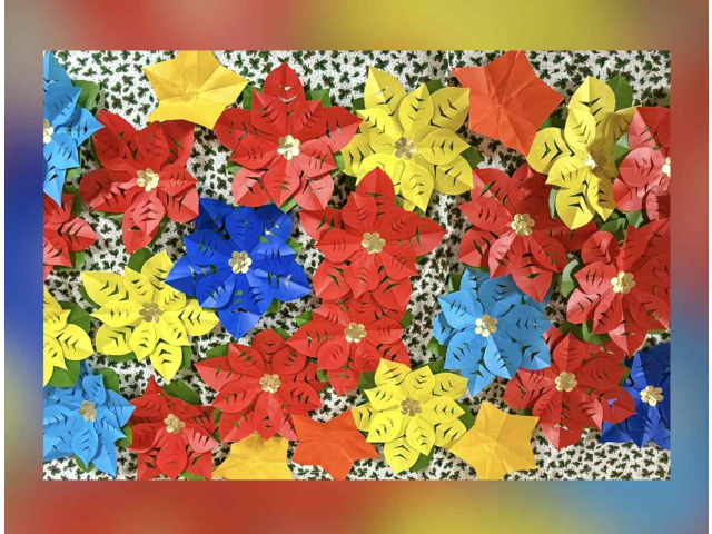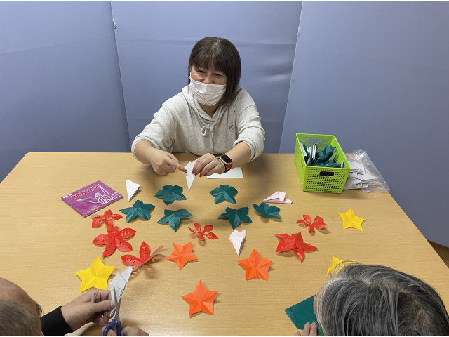 12月に入りました。師走です!クリスマスの飾りつけをこつこつ始めています!利用者様と折り紙でポインセチアのガーランドを作りました!細かい形に切り抜くのが少し難しかったのですが、とても綺麗にできあがりました!
