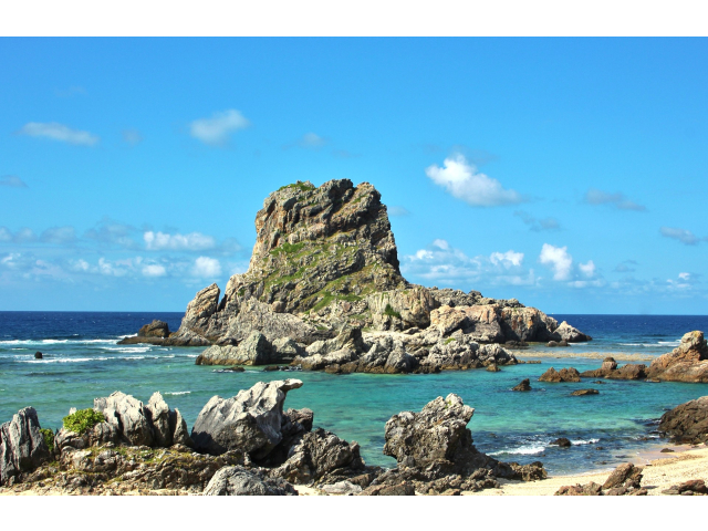 海岸から50mほど沖にそびえる巨岩。干潮時には歩いて渡ることができ、釣りやダイビングのスポットとしても人気です。