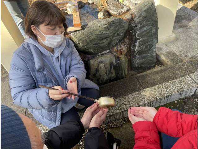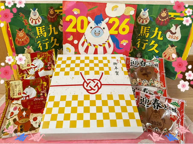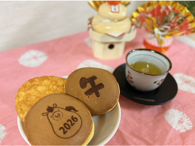 どら焼きとおせんべいが入った柿安口福堂のお年賀セットを提供しました。甘いどら焼きとしょうゆ味のおせんべいの相性はバッチリ!!温かいお茶を飲みながら楽しいひとときを過ごしました(*^-^*)