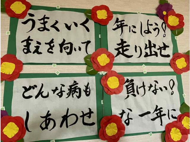 利用者様と一緒に書初めを行いました!!今年の抱負を書くはずだったのに、いつの間にやらそれぞれの思いのたけを書き綴っていました。「私はチーズケーキが食べたい!!」「豚汁がまた食べたい!!」などと大盛り上がりでした。