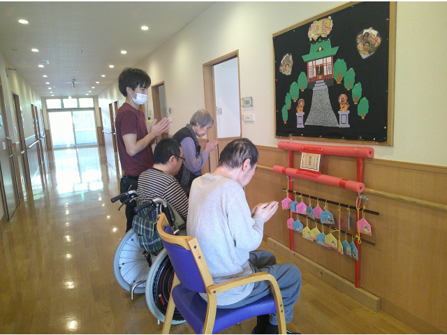 施設内の初詣コーナーで、利用者様と新年の参拝を行いました。