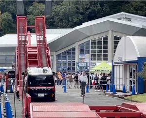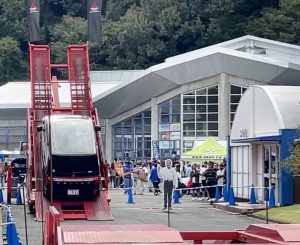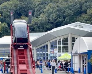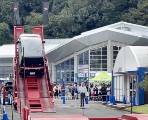 まずは左へ20度の傾斜体験から。途中で後ろのタイヤが1本浮いてしまいましたが、残りの3本で力強く走行。万が一脱輪しても脱出できるそうです!
