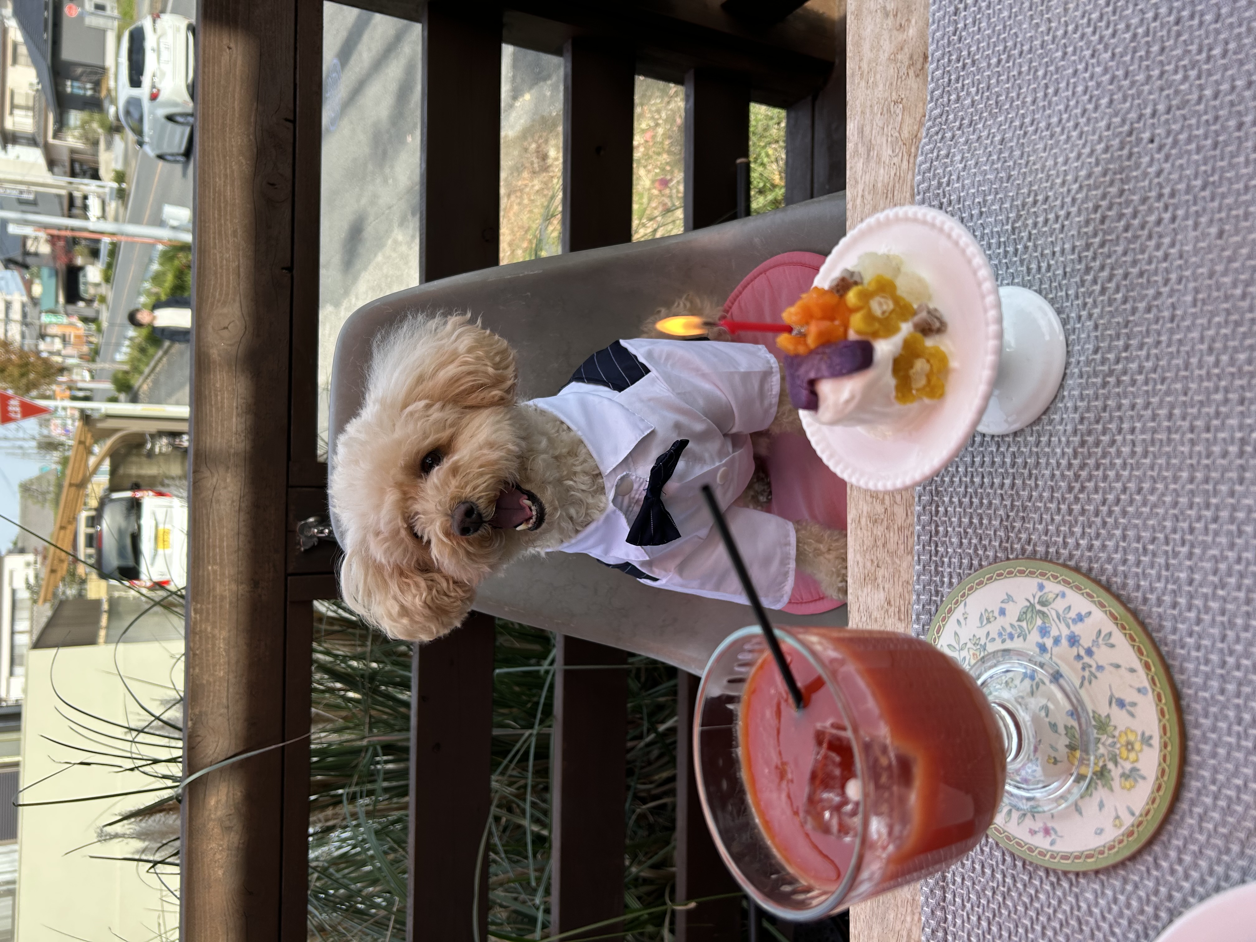 タキシードを着せてペット同伴可のカフェで誕生日会をやりました!手作りで犬用のケーキがあるんです!人間も食べられるとのことなので、試食をしてみたら結構美味しかったです!😋