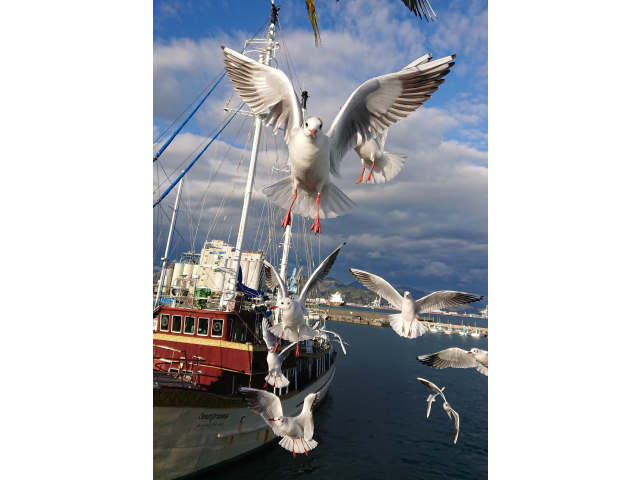 静岡県清水港からフェリーに乗り、ユリカモメの餌やり体験をしました。餌を求めて数十羽が船を追いかけてきます。羽ばたく姿がとても美しく感動してしまいました。